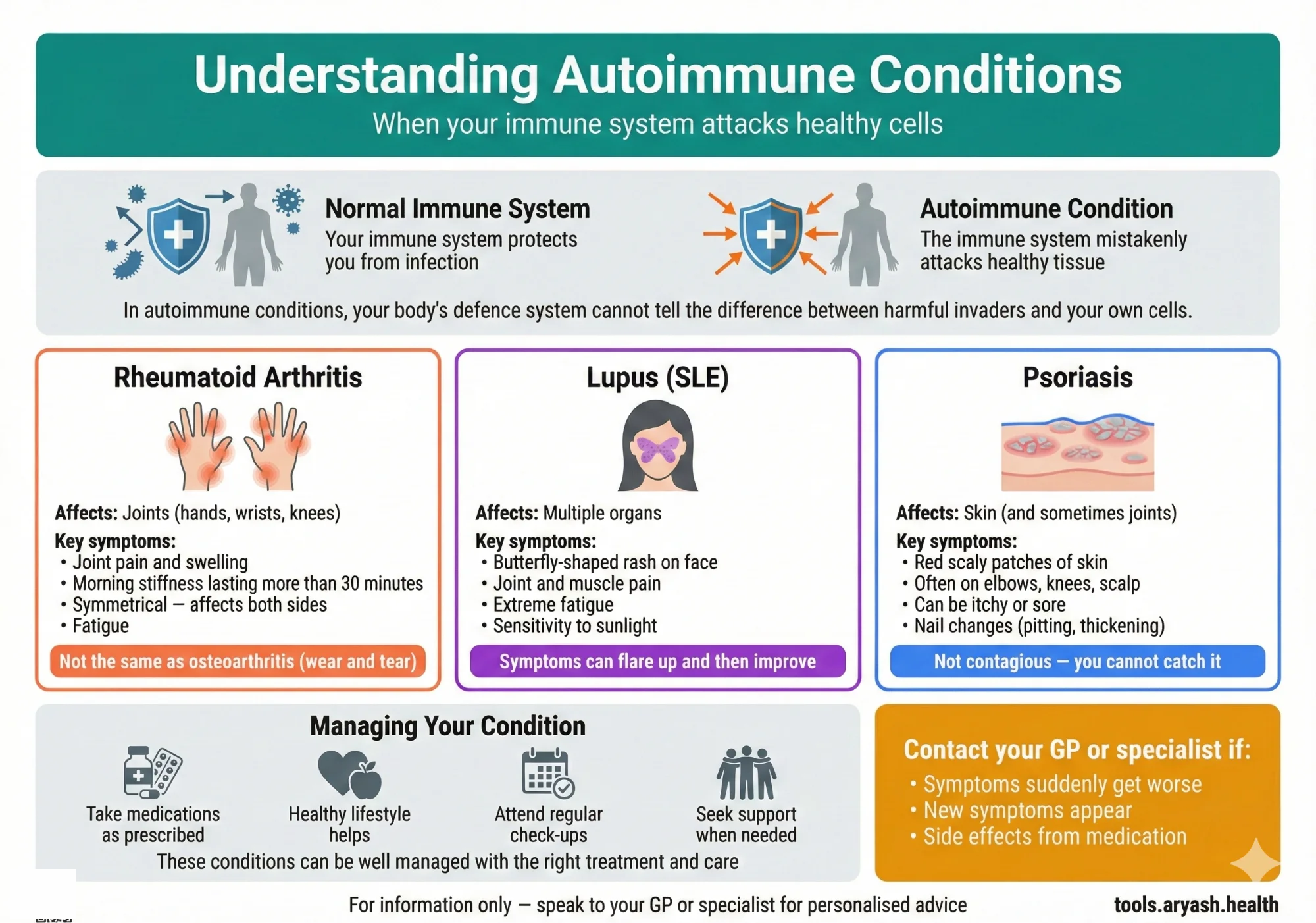Understanding autoimmune conditions: Rheumatoid Arthritis, Lupus, and Psoriasis. Symptoms, differences, and management.