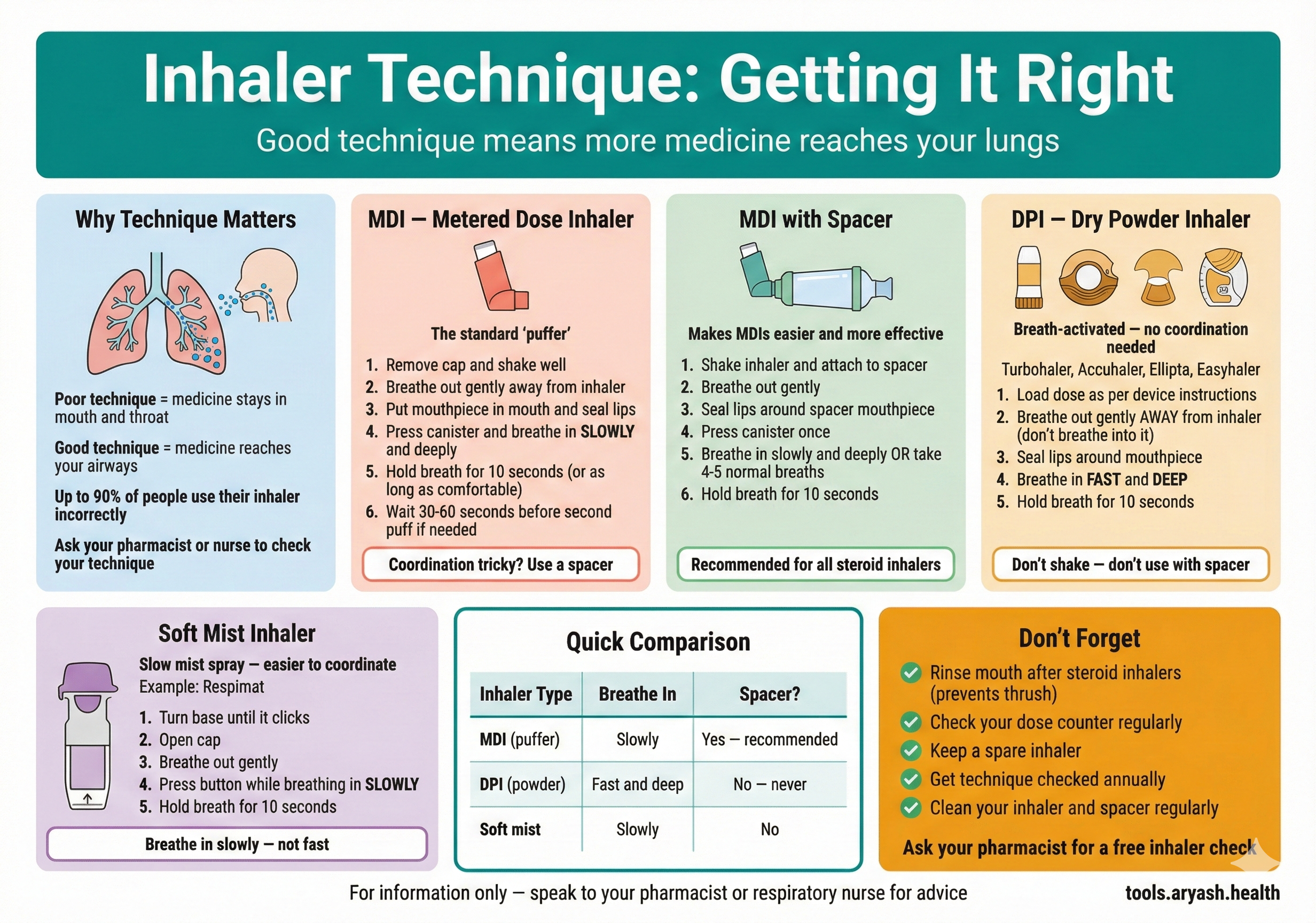 Relievers, preventers, combination inhalers, inhaler colours, and technique explained.