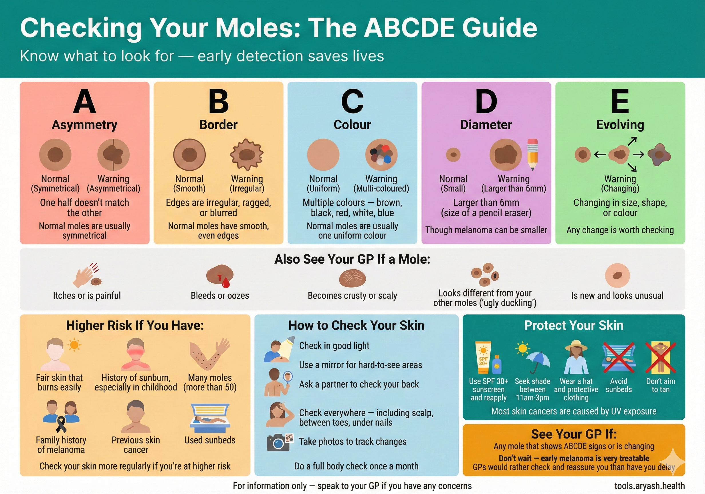 How to check moles for warning signs. Asymmetry, Border, Colour, Diameter, Evolving - know when to see your GP.