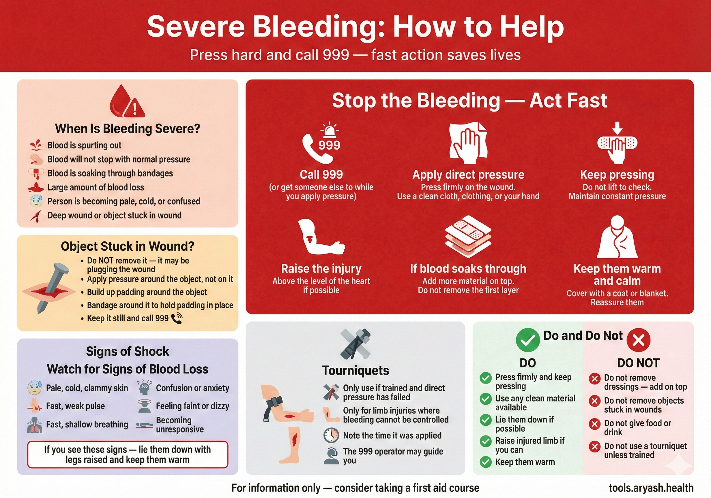 How to control severe bleeding: apply direct pressure, call 999. First aid for major blood loss that won't stop.
